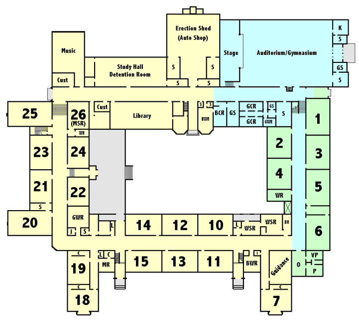 | This "fish-eye" picture from the 1970 yearbook gives a good look at the north wing of classrooms as well as the small door to the left of the gym entry. |
