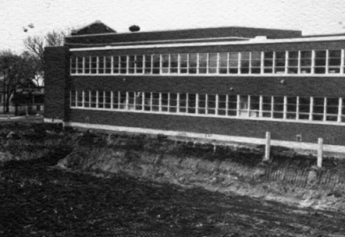 | This picture is actually taken in 1977 when the excavation of the north field made way for the new gym and industrial arts wing. Nevertheless, it is one of the best available pictures of the north wing of classrooms before the lower set of windows was covered by the above named renovation. |
