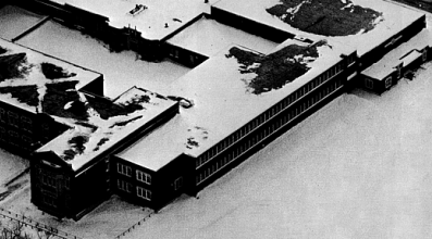 | Here is an aerial view of the north wing of the school. When first built, classrooms on the outside of the school had a view of Wellington Avenue. |