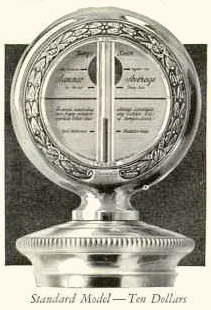 | Another advertisement quote: "... eight million know, as the makers of Boyce Moto Meters knew 12 years ago, that the logical place for a motor heat indicator is on the radiator cap, always in the direct line of driving vision, where it is not necessary to shift the eyes from the road to the dashboard." |