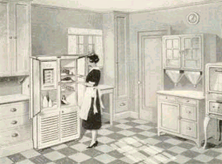 A quote from a 1926 advertisement: "The development of Frigidaire electric refrigeration has brought about a new type of kitchen architecture - more convenient, more attractive, more efficient - designed without the handicap of providing for an outside ice supply." ... "the use of Frigidaire can greatly improve the plan of kitchens for new homes" ... "Frigidaire, installed in your own ice-box, can produce a remarkable transformation in the convenience and efficiency of your present kitchen." |