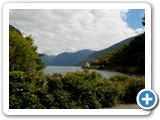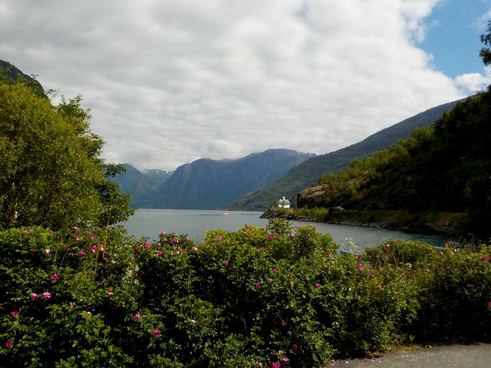 As I walked back, I saw Lottie and her parents in two eco-cars. There was also a spot where you could go right up to the river so I did. When I realized how close Flam was, I decided that I'd at least try another trail in Fretheimshaugane Park. The climb up was fairly steep but the trail zigged and zagged to make it a less vigorous climb. The vegetation in the park was lush. My favourite greenery was some kind of fern which had a layered look. The views from above were also great. When I got to a fork along the path, I wasn't sure which way I should go. Further up? It might lead me to where I'd already been. So I went down. That path zigged and sagged down, and brought me to the back of the Bakkastova Cafe. Perfect! Time for lunch. I ordered a quiche which was very good and some kind of wildberry juice drink.