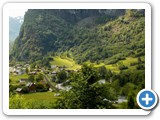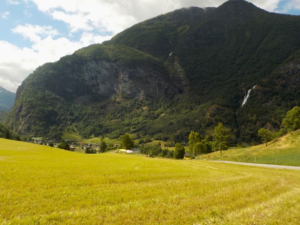 Perhaps the other people didn't want to climb further up the hill or maybe they knew the trail which branched off half the way up the road would meander parallel to the shore below but I decided to climb further up the hill. I wasn't too tired and it seemed that the path above might lead towards the waterfall in the distance. I was actually following a road which led to farms and houses perched above the harbour. I saw lush fields and cows and had excellent views down toward Flam the further I climbed. Finally this road levelled off well above Flam's main road. I saw a small town in the distance and realized that the waterfall was near that town. Not knowing where the road was going to take me and how long it would take to walk there, I struggled with the decision... should I go on? Lucky for me, a car came along (only one of two I'd see the whole time I was on the road) and I flagged down the driver. He assured me that the road I was on would go back down the hill on the other side and the road I'd find myself on would lead back to Flam. Now that the decision was easy, I kept going.