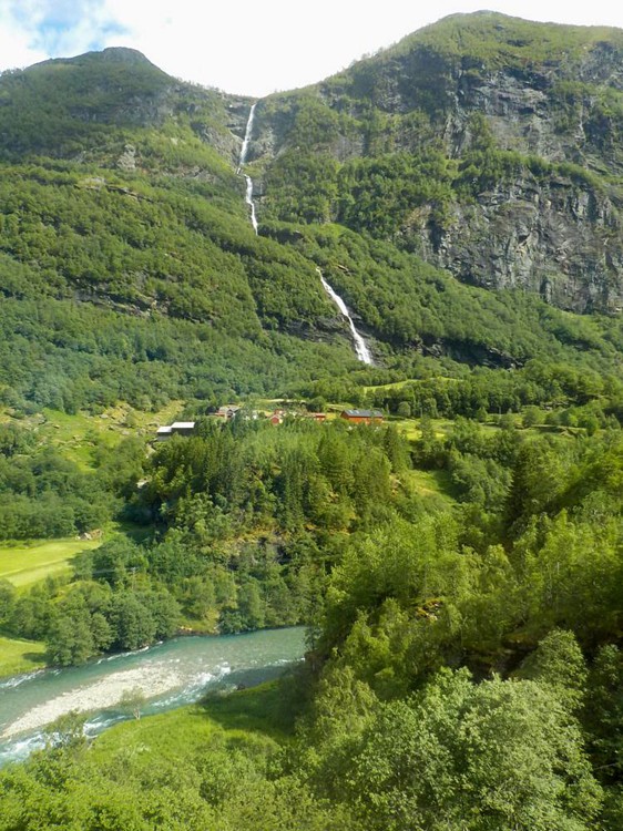 The views on the remainder of the trip back were also outstanding. There certainly was no shortage of waterfalls in the area. I kept thinking... oh! that's the waterfall by Flam. We're back so soon? No? Oh... another one... that must be it. No? We also travelled beside the beautiful river for much of the way. Farms, houses, towns completed a pretty views. As we passed Lundaakeren, I saw a suspension bridge going over a section of the river. DARN! I would have loved to use it. DARN! I should have gone back. Well... maybe I will another year!