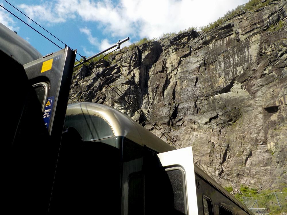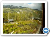Upon boarding the train, I made sure I sat on the side of the train which would afford me views that I had not yet experienced. Unfortunately, I did not realize that not all windows on the train opened and from my seat, I had to take pictures through the glass. Oh well... you can't win them all! The first thing I noticed was that my "hidden valley" was visible from that side of the train. I also realized there was a view of the hydro dam. Hmmm... Then we were at Kjosfossen again. I decided it was worth seeing them again so I went out. When I sat back down, I had a view of... What! WAIT! Those waterfalls in the distance... are those the ones I was beside in Vatnahalsen?? It all didn't make sense until I looked a a map after my trip. First: it seems the only way other than the railway to get to Vatnahalsen was along a road at the bottom of said valley (yes, you can see the paved road in the pictures if you look carefully) then to take the gravel twisting road by the waterfall up. That means I could have probably gone a bit farther and a bit closer to those falls. Second: although it seems kind of weird, Kjosfossen was actually tucked away to the right of my viewpoint. Perhaps the platform they were building would be high enough and stuck out enough to see both the hydro dam and Kjosfossen? Peak at the map of the area I've included to see what I'm talking about. I've also included a picture of the viewing platform they were building. Too bad I wasn't brave enough to go out to it...