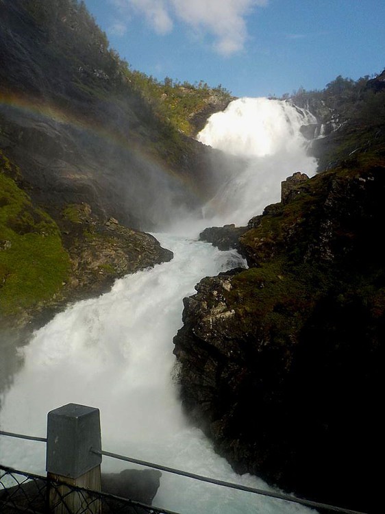 There was a spot on the railway where the train slowed down and we entered tunnels/fenced in track where the train made a 180 degree turn along the mountainside. Once we completed the turn, the train stopped at the most amazing waterfalls... Kjosfossen. We were allowed to leave the train for 5 minutes to go out on a platform in front of the falls and take a picture. The water moved so quickly and dropped so steeply that a rainbow was created in the mist. The train tracks were obviously above where the water continued on its downward journey but I was on the wrong side of the train to see it. I know the drop was still very steep since you could see nothing out the other window except rock faces beside us or in the distance.