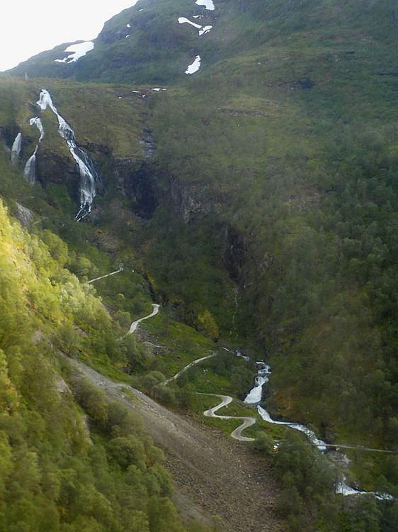 To go down the hill, I followed the switchback road and had to cross railways tracks to get to the river I could now see. The town and the waterfalls were on the other side of the river. The bridge was fairly far down the road. Not having a clue just how the walk back to Flam would be, I decided not visit the town. Too bad. Flam turned out to be just around the corner. I would have had lots of time to make the walk. Whatever.
