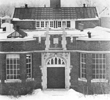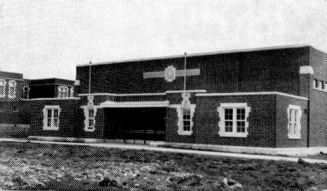 | The erection shed still stood beside the new Gymnasium/Auditorium. Here is a great view of the west exit to the quadrangle with the erection shed in the background and the new gym on the right. |