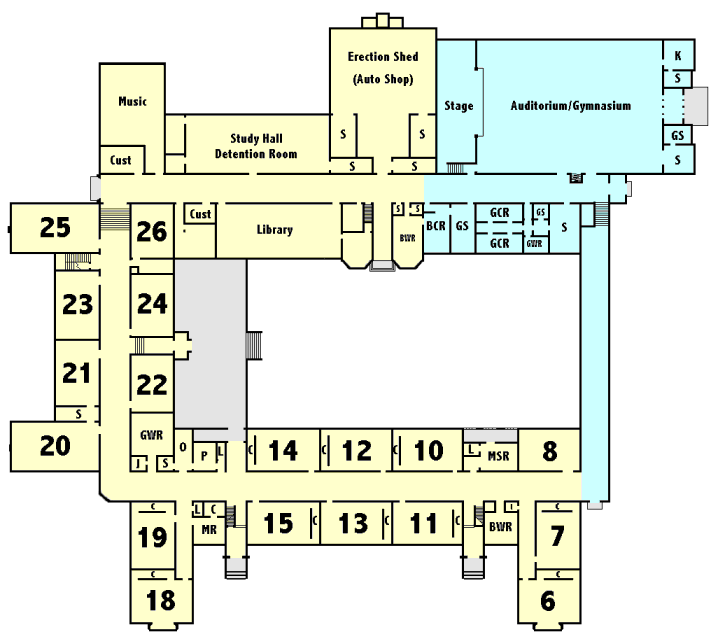 Notice on the left of the picture above that a corridor leading from the new gymnasium/auditorium to the original wing finally enclosed the centre courtyard, finally making it a "quadrangle" as it had been originally planned. See the blueprints below to see the 1954 addition (in blue). Note that the old "Boys' Gymnasium" became a Study and Detention Hall and that the "Girls' Gymnasium" became the Library.