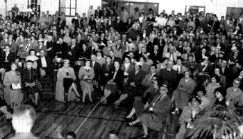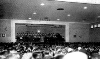 The first students' assembly - the students sat on the gym floor facing the new stage. | |