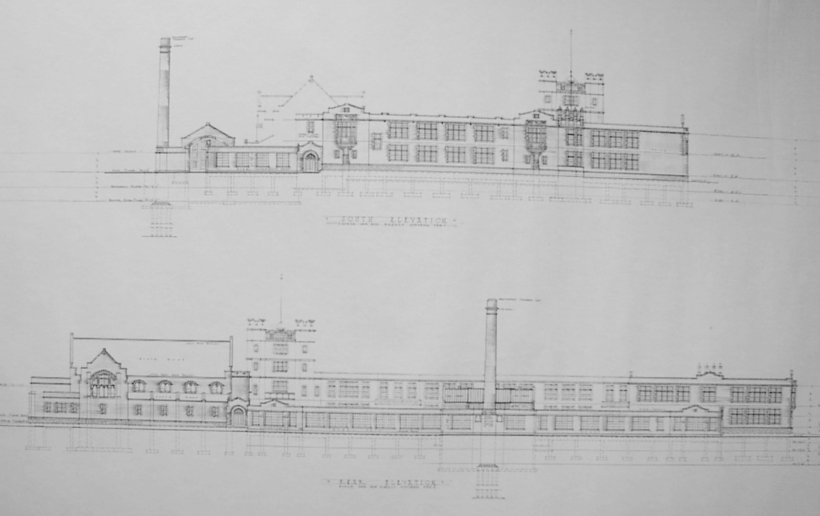 The West Elevation will be the one that is most unfamiliar to the modern student. Again, due to budget cuts, much of this wing was not built. From this angle, you can again see the auditorium (left) and you can also see a single storey where shops such as "Electrical, Blacksmith & Tinsmith, Dynamo, Welding, Gas Engineering, Wireless, Ignition, and Workshop" rooms were to have been built. Immediately to the right of these rooms was the Erection Shed and smoke stack. Both of these were renovated in the 1970s and no longer appear the same. From this viewpoint, the windows of the boys' gymnasium (present day Choir Room) can be seen. At the right corner of the building was the original Music Room, although it had been planned as a "Pattern Shop".
