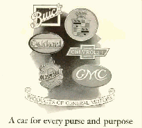 | General Motors advertised that they had an automobile "for every purse and purpose". Even then, divisions of the company included Buick, Cadillac, Chevrolet, Oldsmobile, and GMC but Pontiac did not yet exist. An Oakland division did. |