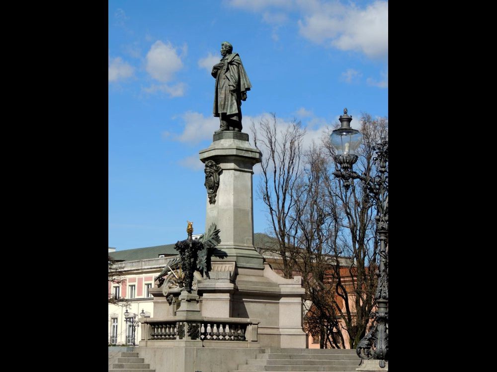 April 8th Once Lynn had taken her bag to our new room (our original one had been above the bar with live, LOUD music until 1 a.m. and I'd requested and gotten a change of room), she was ready to do some exploring. She said OK to walking to Old Town with a stipulation that we could and would rest along the way as necessary. So... we ended up retracing my walk from the previous day with two differences. First, the day was much sunnier and therefore more enjoyable and second, we didn't turn back at the University... we continued along right into the heart of Old Town.We passed sights I'd already seen... the statue of Charles De Gaulle which was in the vicinity of the landmark palm tree... Lynn thought the tree was likely a decorated cell tower which makes sense. Holy Cross's green spires looked especially nice in the sunlight. The Polish double eagle on the gates of the University shone in the sunlight. One of our "rest stops" was on a bench near Kosciol Wizytek Catholic Church just past the University gates. Flowers and trees were in bloom which made the rest stop very pleasant. We continued past the Presidential Palace which featured a statue of Prince Jozef Poniatowski on a horse and the Adam Mickiewicz Monument. When we got to the Tara Widokowy (an observation deck up about 140 stairs though I lost count!), Lynn stayed on terra firma while I tromped up the stairs to gain a different perspective of Warsaw. There I met two men on vacation from England for whom I took a "picture portrait with a view" and they reciprocated. From the tower, you could see the Vistula River and the National Stadium to the east, the Royal Palace and more of Old Town to the north and many interesting buildings that I'd passed on the bus tour to the west. Lynn and I continued past the Royal Castle of Warsaw, the square with the tall Sigismund's Column, and went down the street passing the Archdiocese Basilica and the Shrine of our Lady of Grace. I showed Lynn the picture of the bombed out buildings which had now been restored or replaced. Once at or near the main square, we entered some shops to check out amber and other jewelry, even buying some! I found some nice earrings for my sister and a nice ring for my niece. For myself, I found a very nice pendant. The square had been busy that morning but now that later afternoon had arrived, the square was even busier. There were many people eating at the outdoor patios and even more going in and out of the many shops on the ground floors of the residences which surrounded the square. |